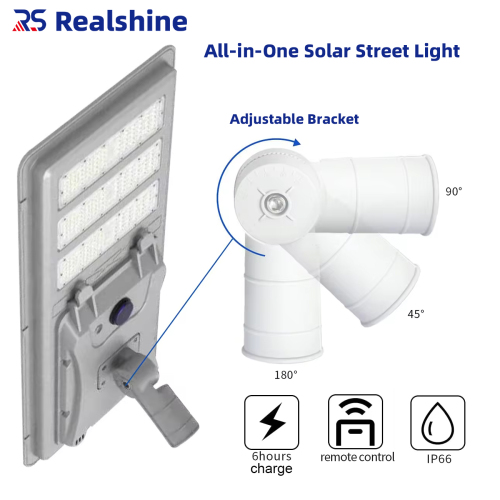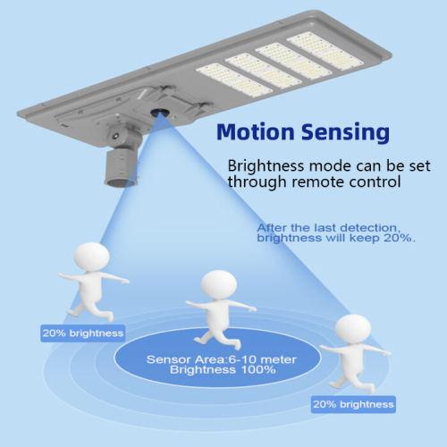 The solar-powered LED road lamp comes with two convenient control modes: motion sensing and time control (dusk-to-dawn).
