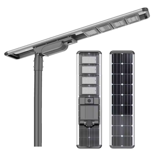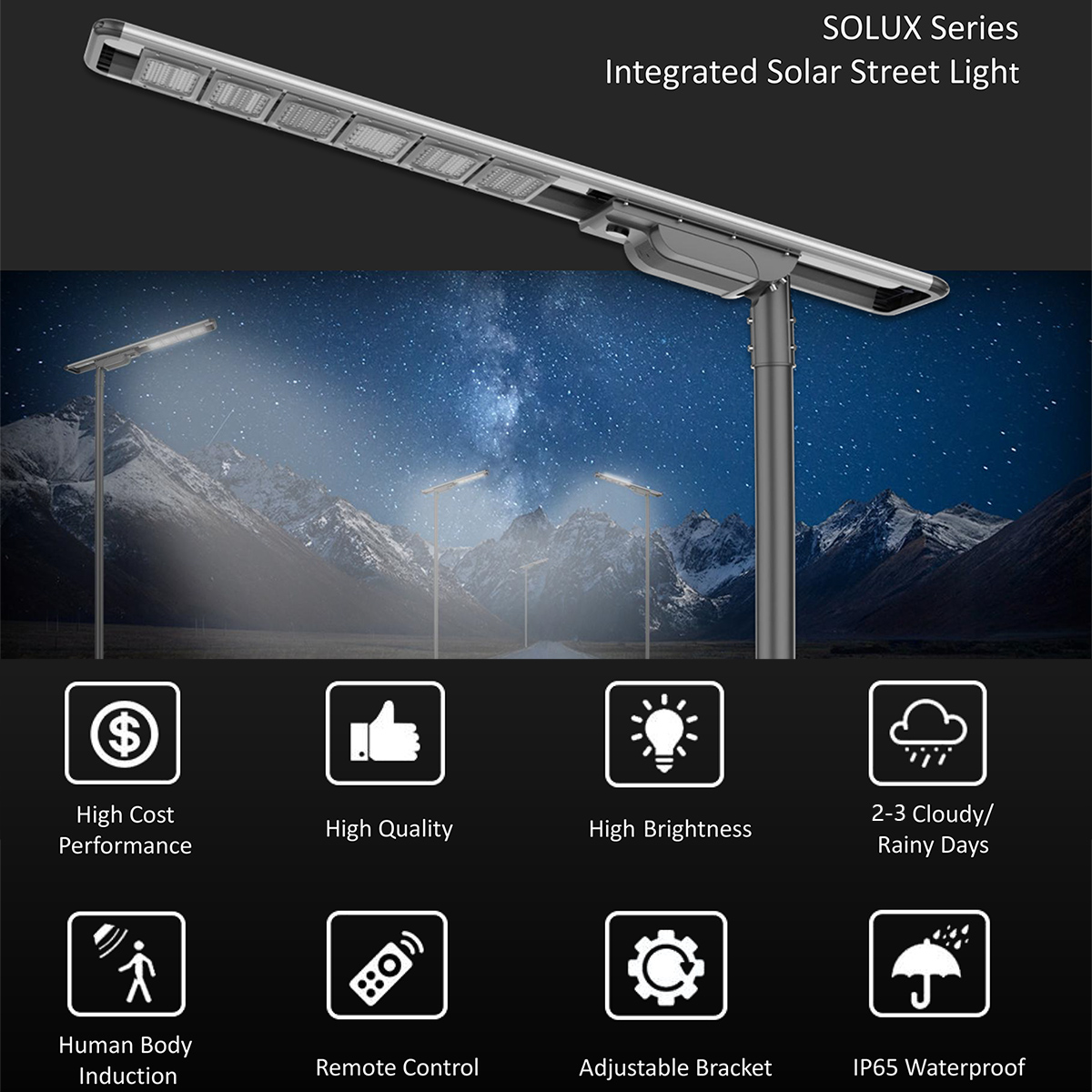 The Realshine Solux Series Solar LED Street Light presents an all-in-one design that includes the lamp fixture, lithium battery, and photovoltaic panel, making installation a breeze. It boasts of energy-efficiency and a longer lifespan even during cloudy or rainy days with its motion sensor and remote control features.